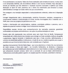 Apesar da renúncia, Yuri destacou ações que considera estruturantes em sua gestão, como a regularização de salários atrasados, avanços na recuperação judicial, melhorias na Ilha do Retiro, investimentos na base e conquistas esportivas como o tricampeonato pernambucano. O dirigente afirmou que permanecerá até o dia 12 para assegurar a transição, garantindo a entrega de documentação, contratos e relatórios que continuarão orientando o funcionamento do clube.